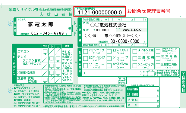 小売業者は、家電リサイクル券を用いることで廃家電の排出者からの引取りと製造業者等への引渡しがスムーズに行え、製造業者等へのリサイクル料金の支払いの手間も簡便化されます。また家電リサイクル券には券ごとに固有のお問合せ管理票番号が印字されており、排出者はこの番号により、家電リサイクル券センターのホームページやフリーダイヤルで製造業者等への引渡し確認も行えます。
